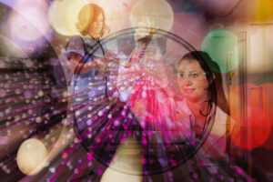 Double exposure of scientists and nurse over city lights